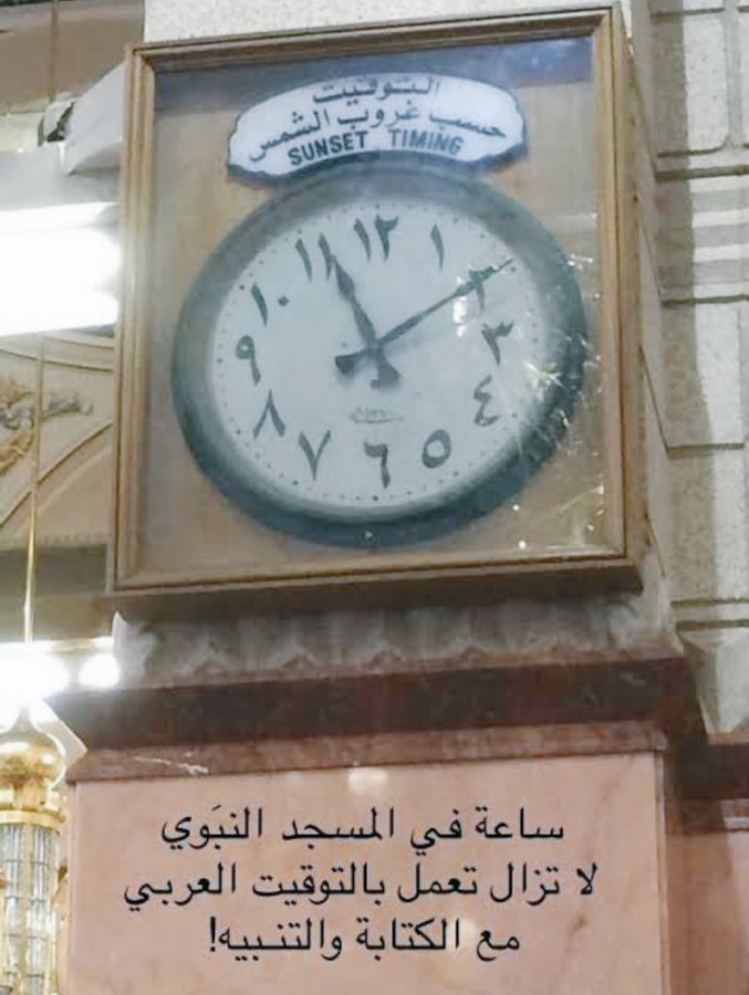 يحتفظ المسجد النبوي الشريف بهذه الساعة كساعة تراثية قديمة تعمل حتى اليوم وفق التوقيت الغروبي، وتبرز كمعلم تراثي أصيل يقاوم الزمن، يقف قبالتها الزوار في حيرة نظرا لنظامها التوقيتي الغامض، الذي يستند على غروب الشمس، ليبدأ اليوم الجديد بضبط العقارب على الثانية عشرة تماما،..
