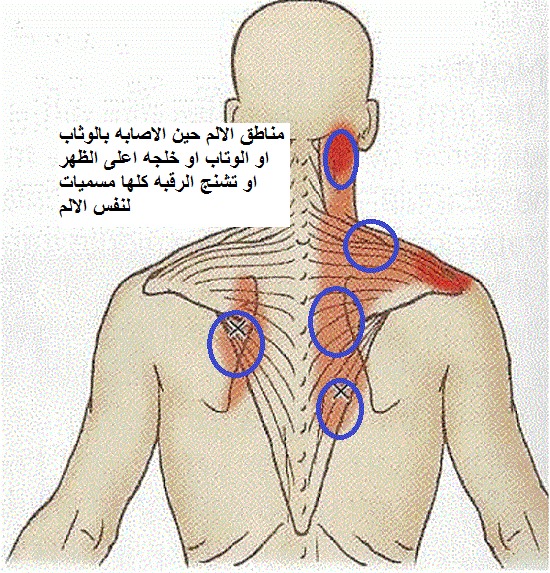 الاعراض: الم يكون متمركز في احد الدوائر في الصوره المرفقه الم عند اخذ نفس عميق الم عند حركه معينه او وضعيه نوم معينه هنالك عقد متشنجه عند فحص العضلات
