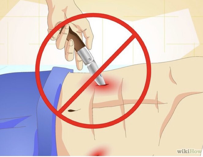 ١- ستؤدي إزالة الأشياء من الجروج الناتجة عن الطعن إلى زيادة فقد الدم وبالتالي تزيد من فرصة وفاة ذلك الشخص. اترك هذا الشيء. لا تحاول إزالته.