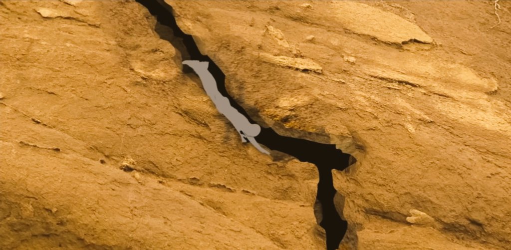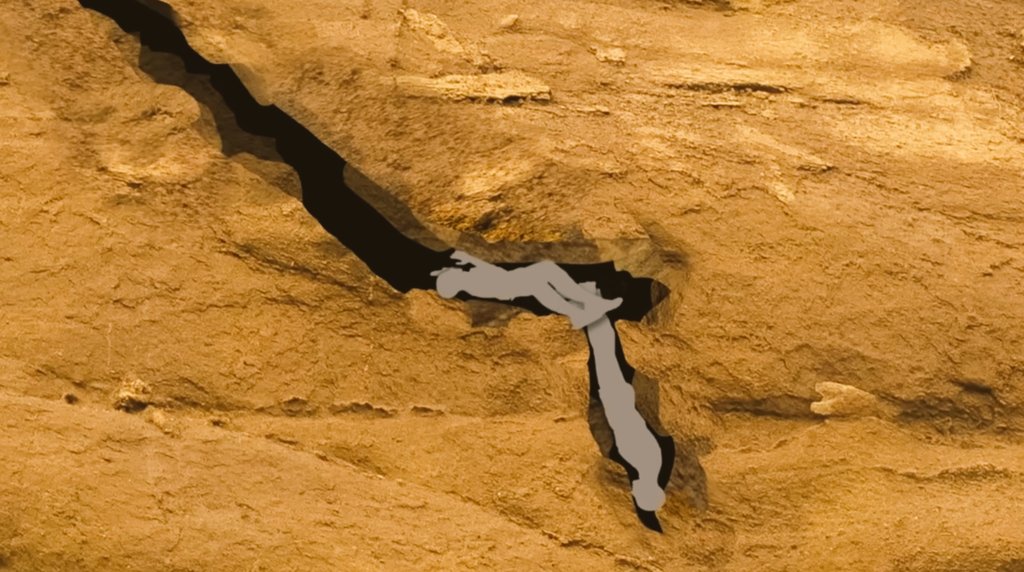 بسبب ضيق المكان لم يكن جون قادر على اخذ نفس كامل، فقط تنفس بسيط وسطحي لان صدره محشور في الصخور