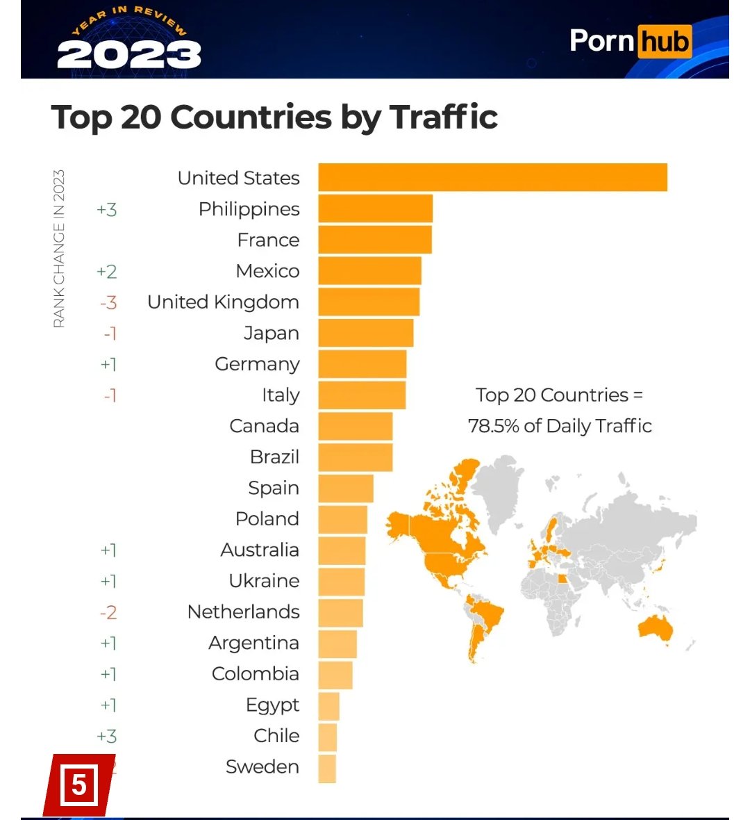 Combined, these top 20 countries make up 80% of Pornhub’s daily traffic