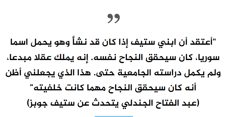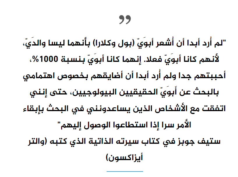 - "أوه، نعم، ستيف جوبز، إنه كان يأتي لدينا باستمرار في مطعمنا، كان شابا لطيفا وكان يمنحنا بقشيشا كبيرا!". هكذا قال لها في حماس، وهو يحكي لها عن قصص روّاد التقنية الكبار الذين زاروه في مطعمه خلال تلك الفترة، وهو ما جعلها تقابل حماسه بالصمت المشوب بالذهول من هول الصدمة، صدمة أنه يتحدث بحماس عن ستيف جوبز ولا يعرف أنه -حرفيا- ابنه!