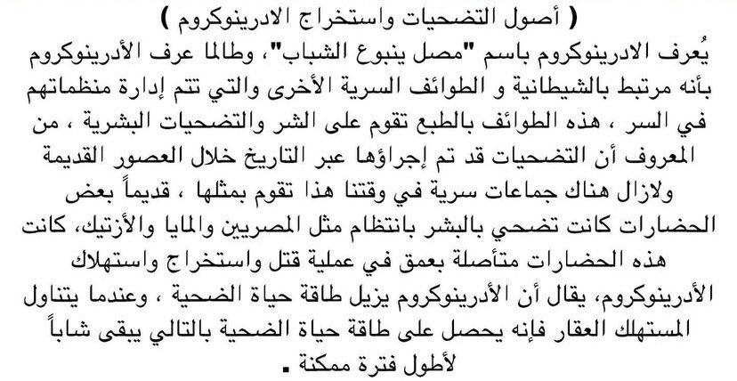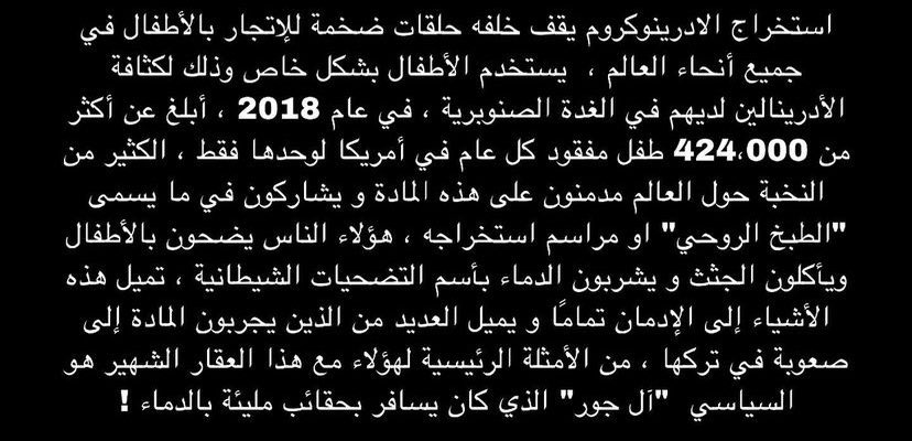 وهناك من يقول بعد أن الاطفال يتم اغتصابهم جنسياً ثم يقومون بتعذيبهم لإستخراج الترياق الثمين الأدرينوكروم ومن ثم قتلهم وتقطيعهم وبيع أعضاءهم!