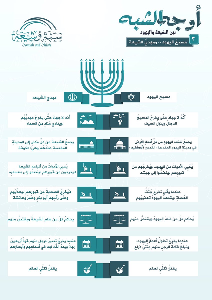 قالت اليهود لايكن الملك إلا في آل داود وقالت الرافضة لايكون الملك إلافي آل ابي طالب وقالت اليهود لايكون جهاد حتى يخرج المسيح المنتظر وقالت الرافضة لايكون الجهاد حتى يخرج المهدي؟!.