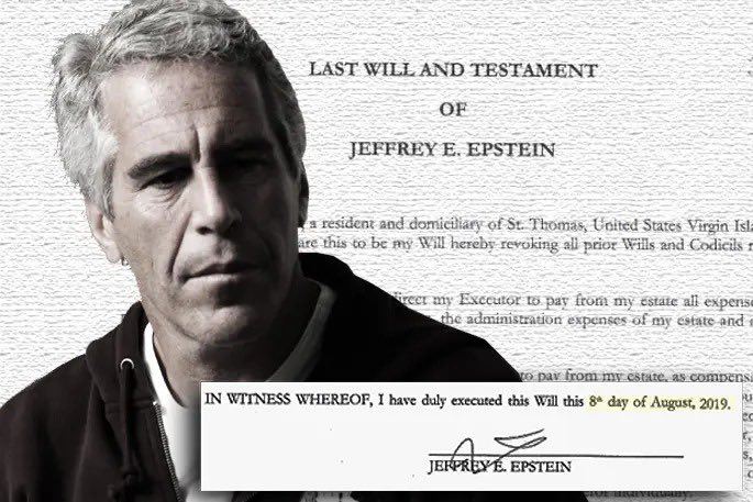 قبل وفاته بيومين استدعى إبستين محاميه، وأبلغهم بوصيته، حيث قام بوضع كل ثروته المقدرة بنحو 577 مليون دولار في صندوق ائتماني في جزر فيرجن، لقد جعل بذلك الأمر أكثر صعوبة على ضحاياه اللاتي يقدرن بالمئات، من حيث حصولهن على تعويضات، وهو أمر يدل على أنه غير نادم ألبتة على ما اقترف.