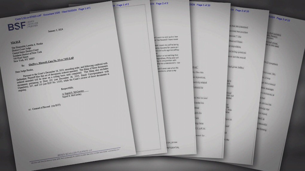 على الرغم من وفاة إبستين، استمرت التحقيقات والإجراءات القانونية في قضيته، وبتاريخ 18 ديسمبر 2023 صدر حكم مثير يقضي بالإفراج عن مئات الوثائق السرية المتعلقة بالقضية، وهو الأمر الذي ترتب عليه مفاجآت جمة حول الشركاء والأصدقاء من الشخصيات العامة الذين شاركوه جرائمه.