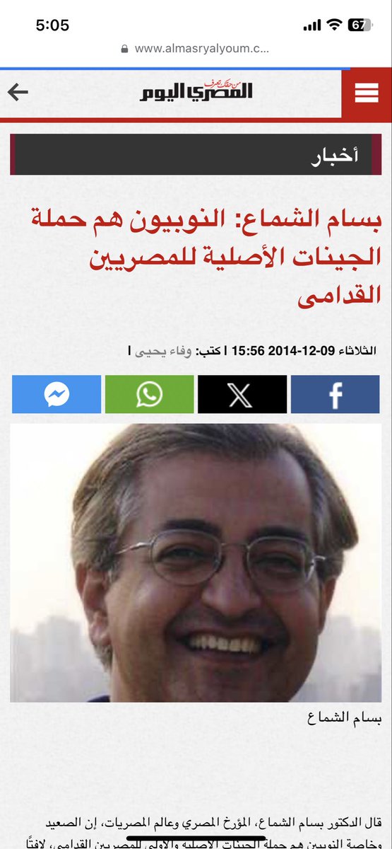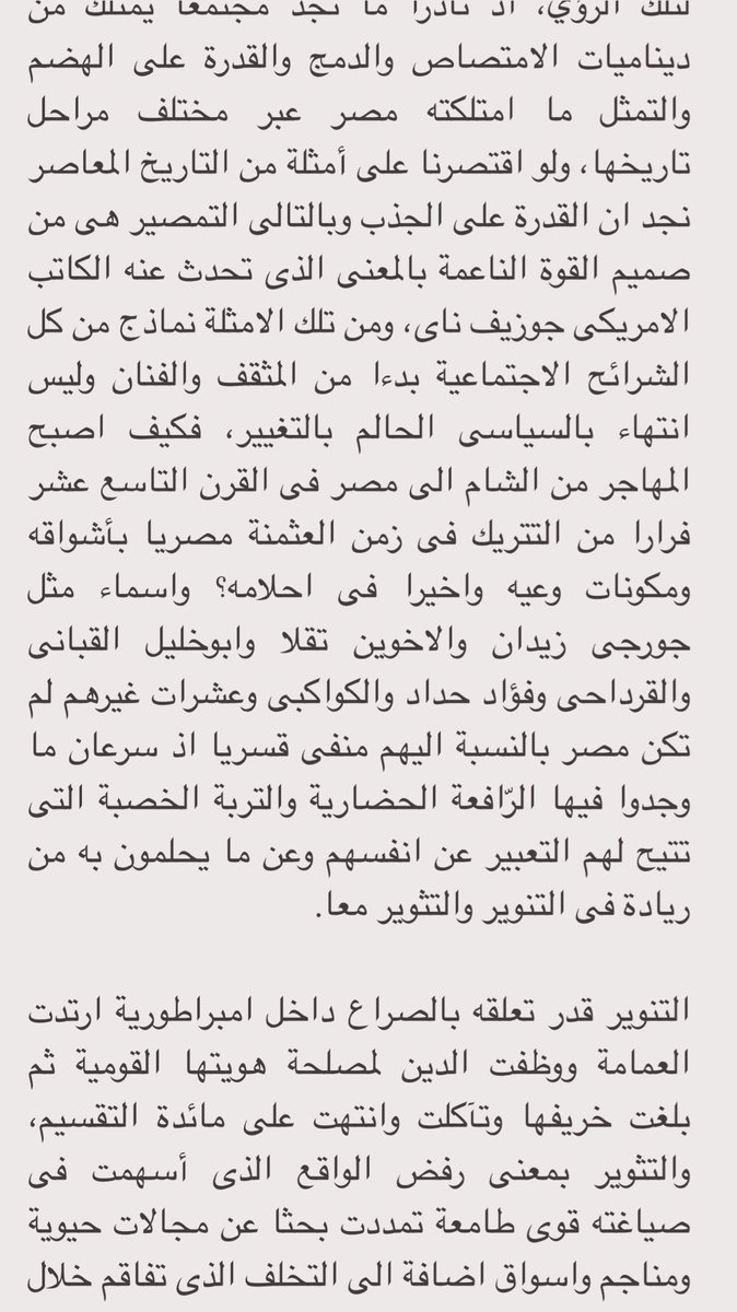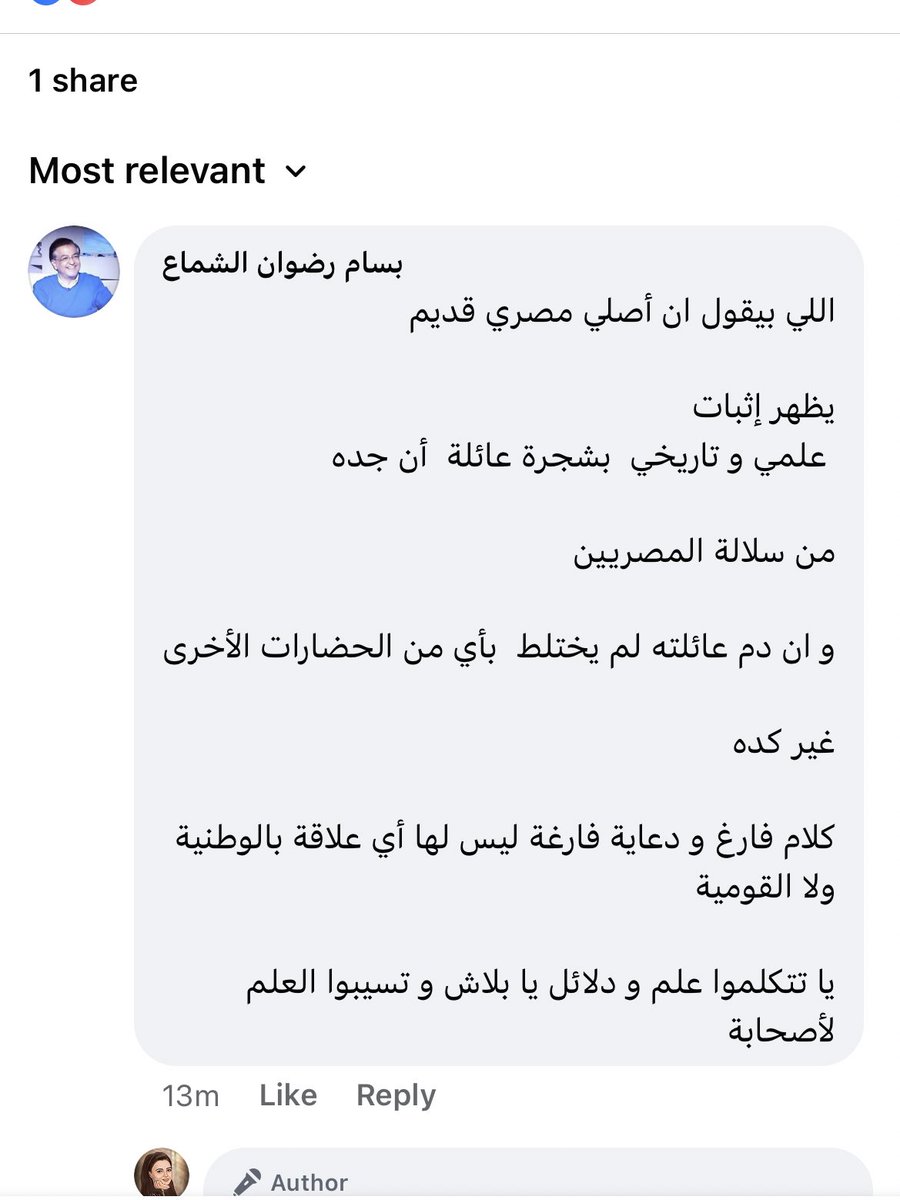 الحالة اللي بيعبر عنها بسام الشماع بتصرخ في وش الحاضر بآثار التجنيس اللي هتظهر هتظهر مهما اتاخرت . بسام ببساطة بيعزي حالة الاحساس بانعدام النقاء العرقي بإنه يمنع عن المصريين تبني الإنتماء للحضارة المصرية عن طريق توزيعها وتفتتيتها. فتلاقيه ينفخ النار في قضايا النوبة كمثال