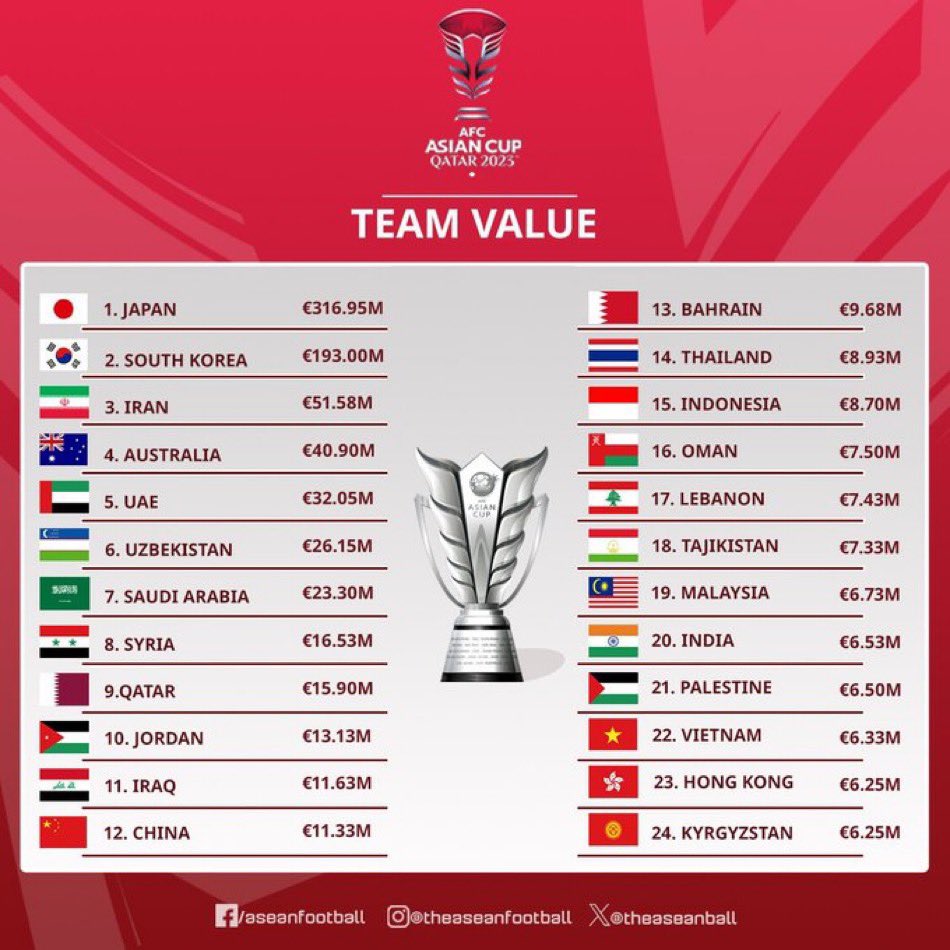 اليابان لوحدها كقيمة سوقية لمنتخبها، تساوي قيمة كل المنتخبات المشاركة في بطولة أمم آسيا باستثناء كوريا الجنوبية.
