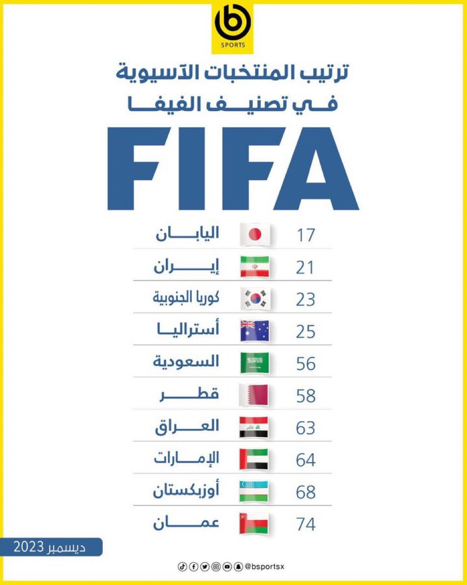 ▪️تصنيف أعلى عشر منتخبات في قارة آسيا المنتخبات الاسيوية.