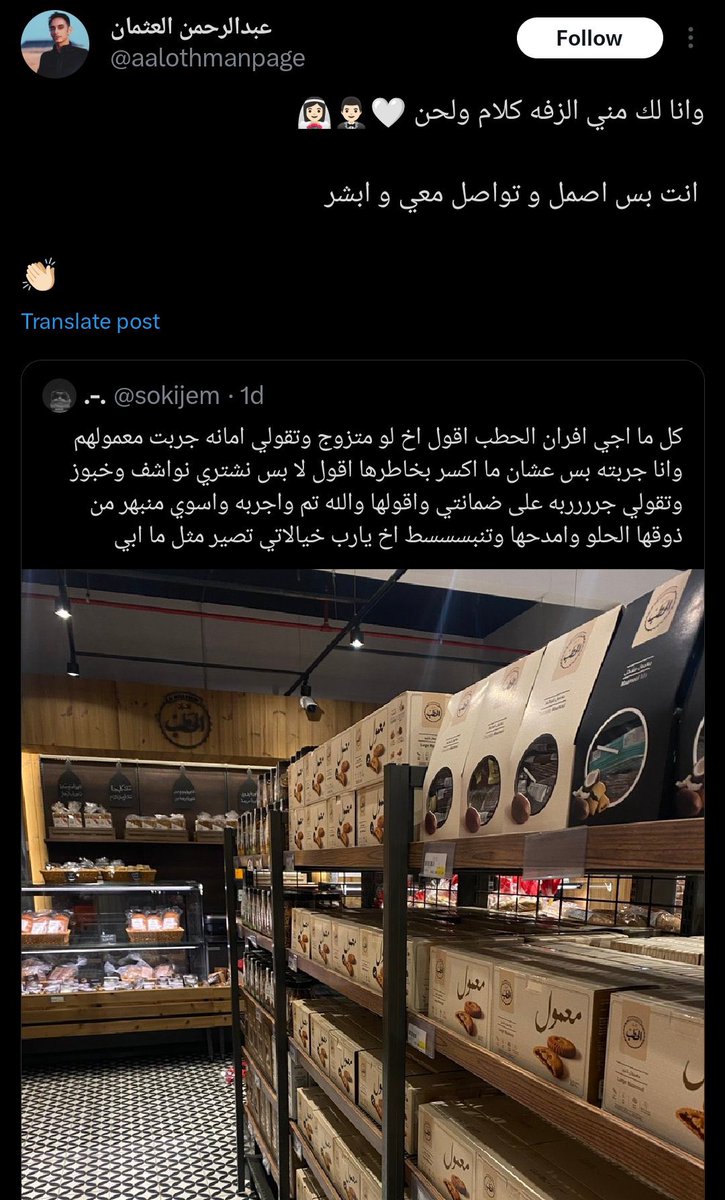 كل ما اجي افران الحطب اقول اخ لو متزوج وتقولي امانه جربت معمولهم وانا جربته بس عشان ما اكسر بخاطرها اقول لا بس نشتري نواشف وخبوز وتقولي جرررربه على ضمانتي واقولها والله تم واجربه واسوي منبهر من ذوقها الحلو وامدحها وتنبسسسط اخ يارب خيالاتي تصير مثل ما ابي