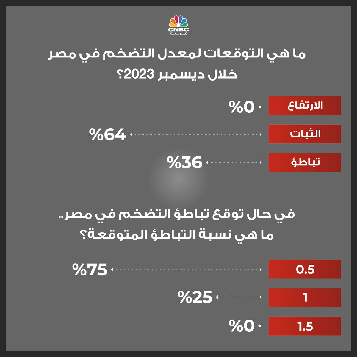استطلاع أجرته CNBC عربية وشمل 11 محللاً في شركات مالية وبنوك استثمار أظهر الإجماع على استبعاد حدوث ارتفاعات جديدة لمعدل التضخم خلال ديسمبر الماضي، حيث توقع 64% منهم أن يستقر معدل التضخم عند الحدود التي سجلها في نوفمبر الماضي والبالغة 34.6%