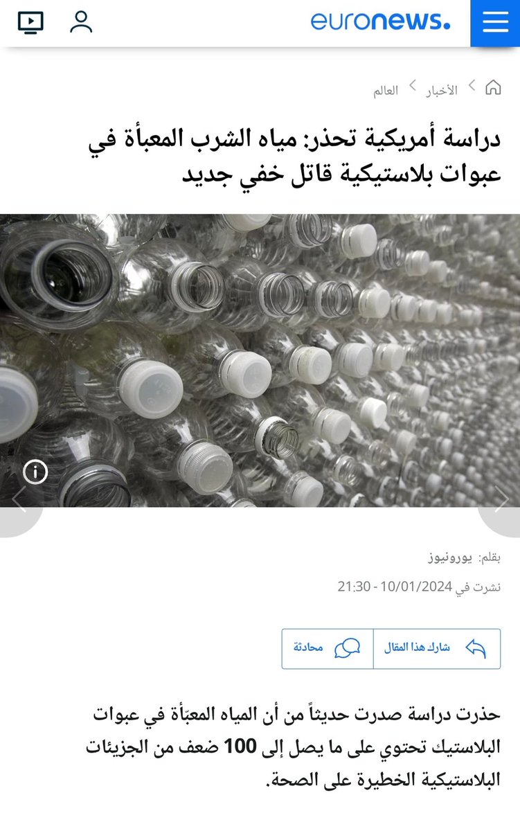 تحتوي #المياه المعبّأة في الزجاجات البلاستيكية قطع بلاستيك نانوية مضره بالصحة، حسب دراسة علمية حديثه 👇
