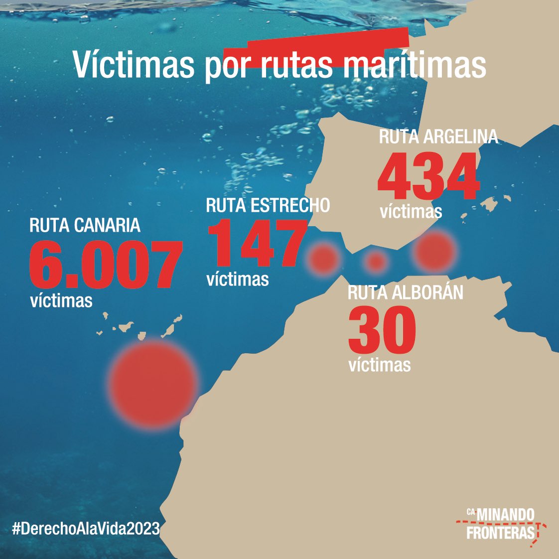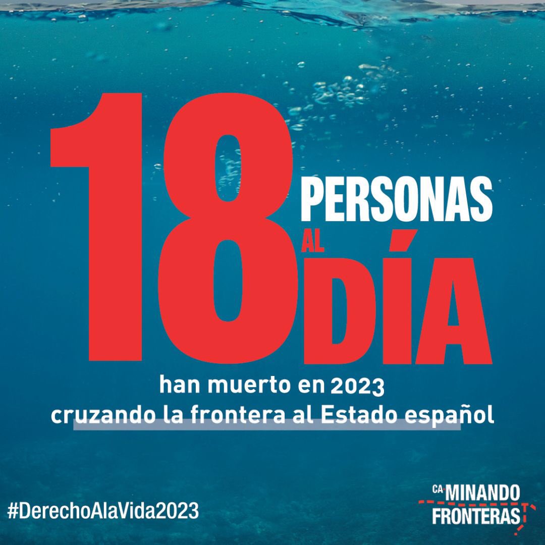 En 2023, plus de 6 000 migrants sont morts en tentant d'atteindre l'Espagne, partant des villes et des eaux du Sahara occidental (18 victimes par jour), ce qui représente environ 90 % du nombre total de victimes de migrants vers l'#Espagne.