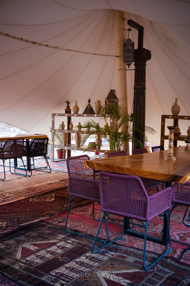 أول نقطة عندك في المنطقة اللي في المنتصف هي الخيمة الكبيرة، وهذي فيها جلسات كثيرة وتنس طاولة و board games والهدف منها تكون مكان تجمع لكل سكان الكرافانات وتختلط معهم وتتعرف على ناس جديدة.