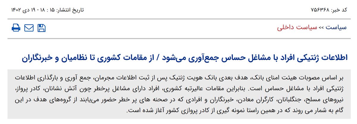 اطلاعات ژنتیکی افراد با مشاغل حساس جمعآوری میشود / از مقامات کشوری تا نظامیان و خبرنگاران