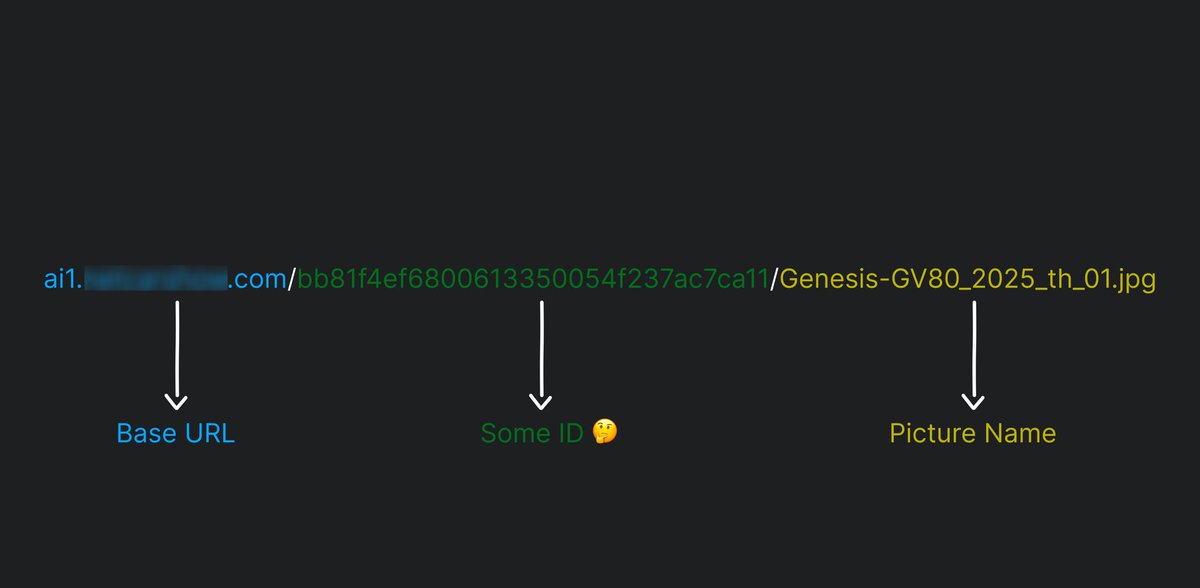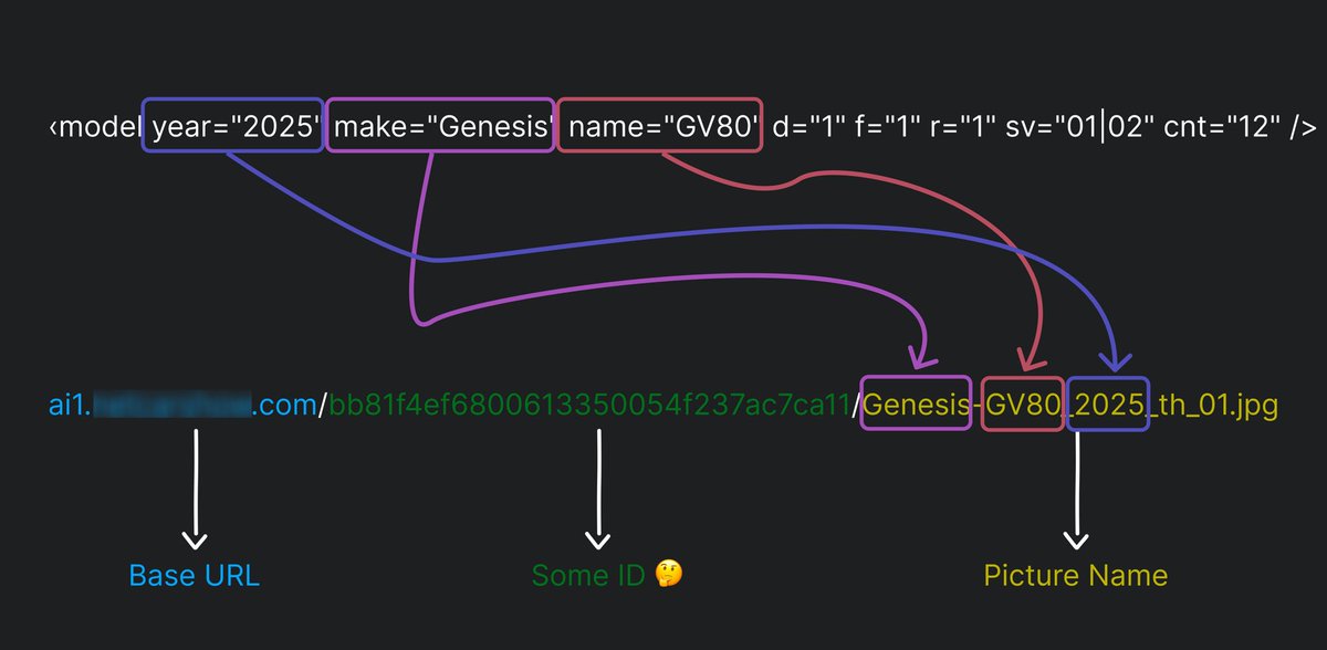 المهم، يمدينا نشوف المعلومات هذي كيف جالسة تُستخدم ببناء الرابط، الحين قدرنا نجيب اغلب ال picture name بس باقي عندنا شيئين ما ندري وش هم: