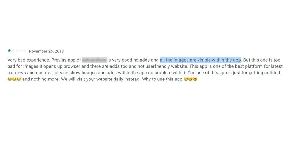 وانا جالس اقفل الصفحات عشان اروح انام لفت انتباهي هذا ال review اللطيف لتطبيقهم على قوقل بلاي. المستخدم زعلان ان التطبيق يفتح صور السيارات بالويب، مو نفس قبل كان يفتح الصور داخل التطبيق نفسه