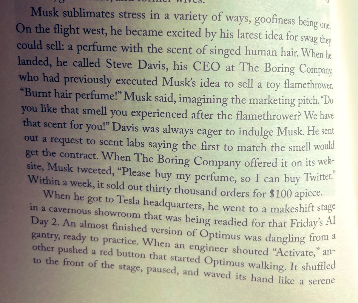 في خضم الاحداث التي عصفت به اثناء المفاوضات الخاصة بشراء منصة تويتر اتصل ايلون مسك بصديق له يعرض عليه فكرة تصميم عطر برائحة "شعر يحترق". صُمم العطر وطُرح في الأسواق وبيع المعروض (٣٠ الف قارورة) في غضون ساعات بمبلغ ١٠٠ دولار للزجاجة (٣ ملايين دولار).