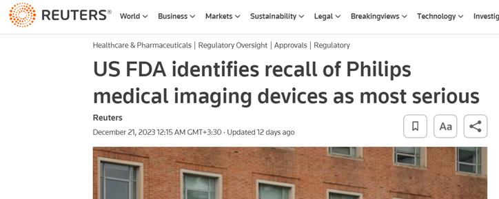 US FDA identifies recall of Philips medical imaging devices as most serious