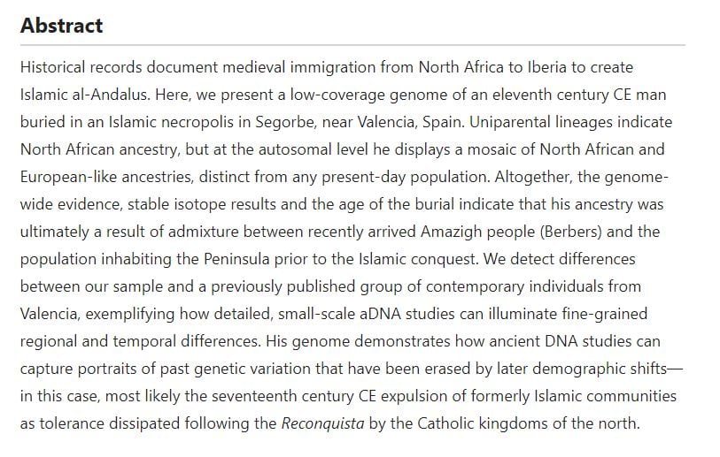 -تشير الأدلة على مستوى الجينوم ونتائج النظائر المستقرة وعمر الدفن إلى أن أسلافه كانت في النهاية نتيجة اختلاط بين الأمازيغ الذين وصلوا حديثًا والسكان الذين كانوا يسكنون شبه الجزيرة الايبيرية قبل الفتح الإسلامي.