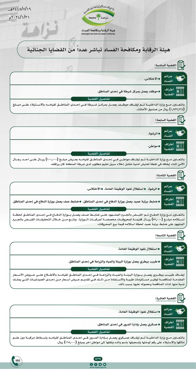 صرّح المتحدث الرسمي في هيئة الرقابة ومكافحة الفساد بأن الهيئة باشرت عدداً من القضايا الجنائية خلال الفترة الماضية، وجارٍ استكمال الإجراءات النظامية بحق مرتكبيها، وكانت أبرز القضايا على النحو الآتي:
