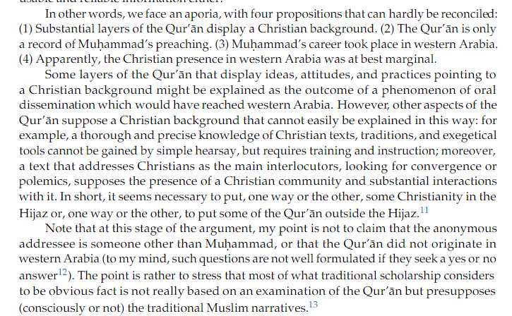 🔸 Cela conduit à un dilemme que Guillaume Dye résume fort bien : ou bien on maintient l'hypothèse selon laquelle le Coran provient du Hedjaz, mais dans ce cas, il faut supposer que la région était tout autant christianisée que le reste de l'Arabie ; ou bien il faut resituer le milieu d'origine d'une partie substantielle du Coran *en dehors* d'Arabie.