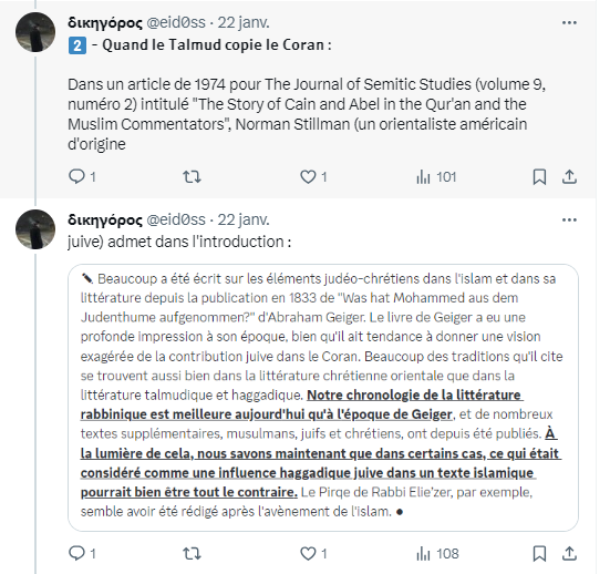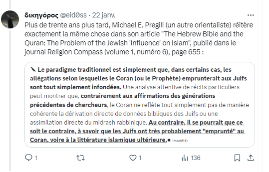 📌 Mais le pire; c'est que @eid0ss est un récidiviste, puisque dans un autre tweet, il cite cette fois-ci Michael Pregill, qui là encore nierait toute influence du Talmud sur le Coran.