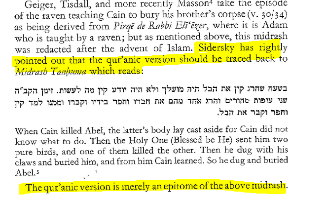 "Dans l'ensemble, le passage de la sourate al-Ma'idah dans lequel apparait l'histoire de Cain et Abel se situe à proximité d'un précurseur dont l'origine est clairement rabbinique" (p.170).