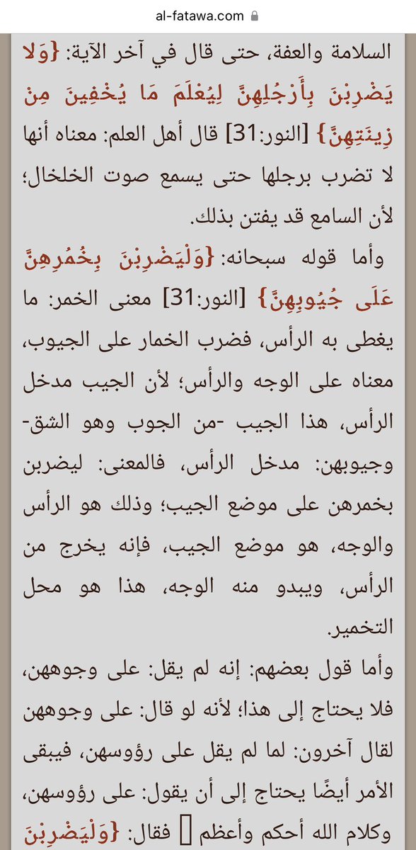 2-وقال الله تعالى : وَقُل لِّلْمُؤْمِنَاتِ يَغْضُضْنَ مِنْ أَبْصَارِهِنَّ وَيَحْفَظْنَ فُرُوجَهُنَّ وَلا يُبْدِينَ زِينَتَهُنَّ إِلا مَا ظَهَرَ مِنْهَا وَلْيَضْرِبْنَ بِخُمُرِهِنَّ عَلَى جُيُوبِهِنَّ النور / 31 .