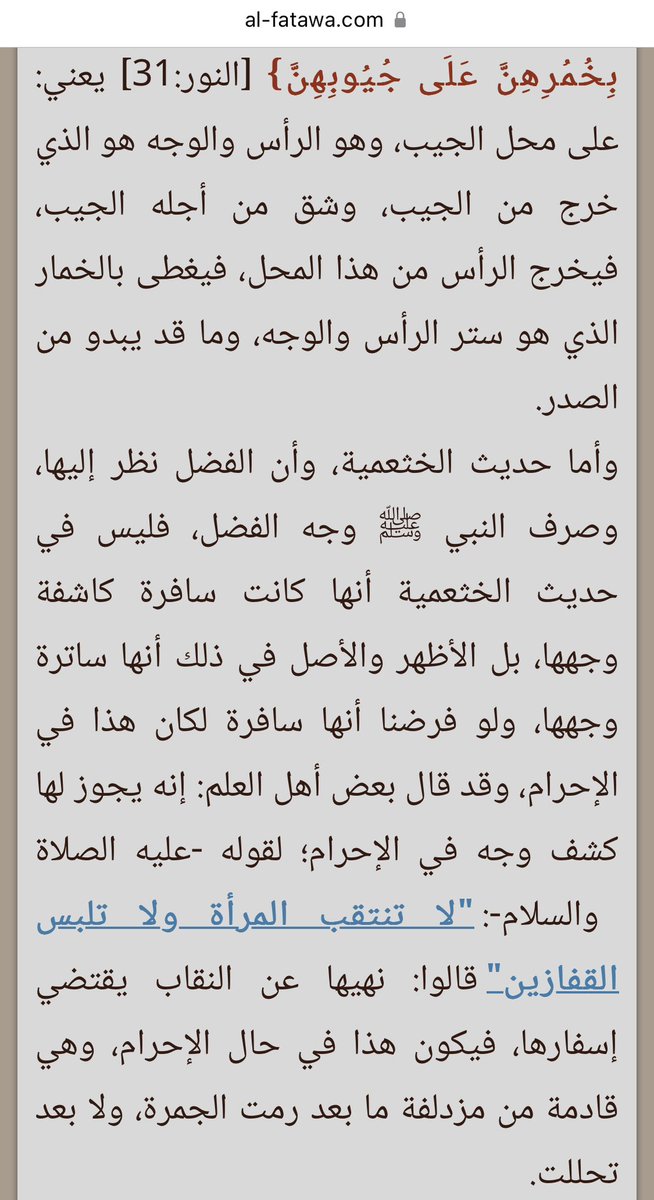 قال شيخ الإسلام ابن تيمية : وهذا مما يدل على أن النقاب والقفازين كانا معروفين في النساء اللاتي لم يُحرمن وذلك يقتضي ستر وجوههن وأيديهن .