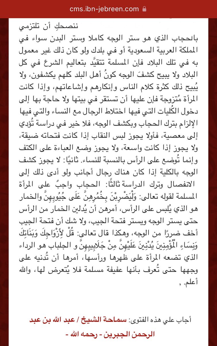 قال إبن عباس رضي الله عنهما : " أمر الله نساء المؤمنين إذا خرجن من بيوتهن في حاجة أن يغطين وجوههن من فوق رؤوسهن بالجلابيب ويبدين عيناً واحدة " .