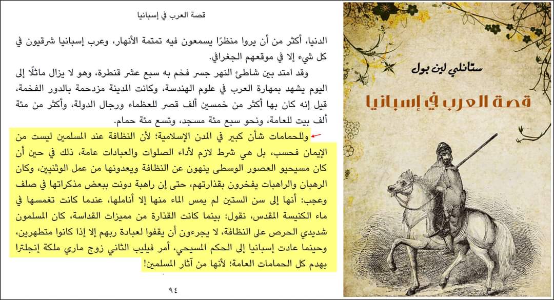 يقول المستشرق وعالم الآثار البريطاني (ستانلي لين بول )في كتابه (قصة العرب في اسبانيا):(أن الموجز الذي نحن بصدد نقله عن مؤرخي العرب في وصف قرطبة وما كانت فيه من نهضة وازدهار ومجد ،انما يعود زمنه الي القرن العاشر ،واذا لحظنا ان أسلافنا السكسون في هذا العهد كانوا يسكنون الأكواخ ويفترشون القصيل ...وللحمامات شأن كبير في المدن الإسلامية ،لان النظافة عند المسلمين ليست من الايمان فحسب بل هي شرط أساسي لأداء الصلوات والعبادات عامة ،ذلك في حين أن كان مسيحيو العصور الوسطى ينهون عن النظافة ويعدونها من عمل الوثنيين ،وكان الرهبان والراهبات يفخرون بقذارتهم حتي أن راهبة دونت ببعض مذكراتها في صلف وعجب أنها الي سن الستين لم يمس الماء منها إلا أناملها عندما كانت تغمسها في ماء الكنيسة ).