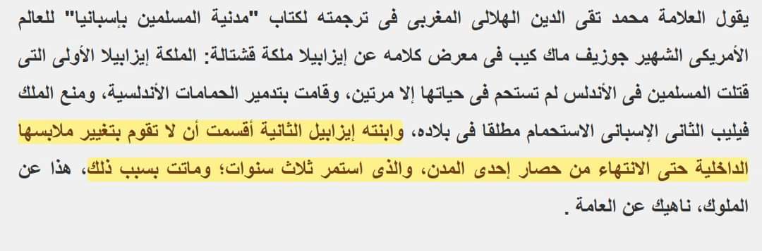 الملكة ايزابيلا الأولى التي قتلت المسلمين في الأندلس لم تستحم في حياتها إلا مرتين ! ، وقامت بتدمير الحمامات الأندلسية .