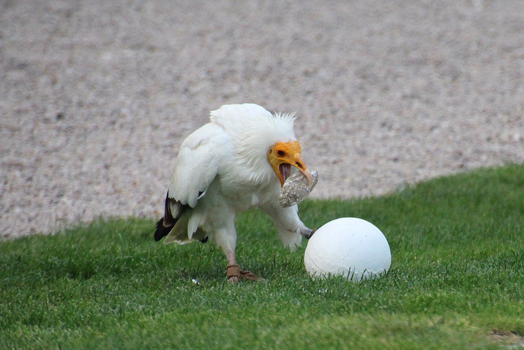 الرخمة من الطيور القمامة ومن المعروف عنها أكلها للجيف (جثث الموتى المتعفنه) لكنها أحيانا يتغذى بالصيد على بعض الزواحف والثدييات الصغيرة والبيض. تعتبر الرخمة من نوعية الطيور التي يعرف عنها استخدام أدوات متاحة كالحجارة الصغيرة لتحطيم القشرة السميكة لبيض النعام أو الحبارى، عن طريق حملها للحجارة بمنقارها والضرب بقوة على البيضة لكي تتشقق، هذا الأسلوب يتم تعلمه عن طريق التشارك بين مجموعات الرخمة.
