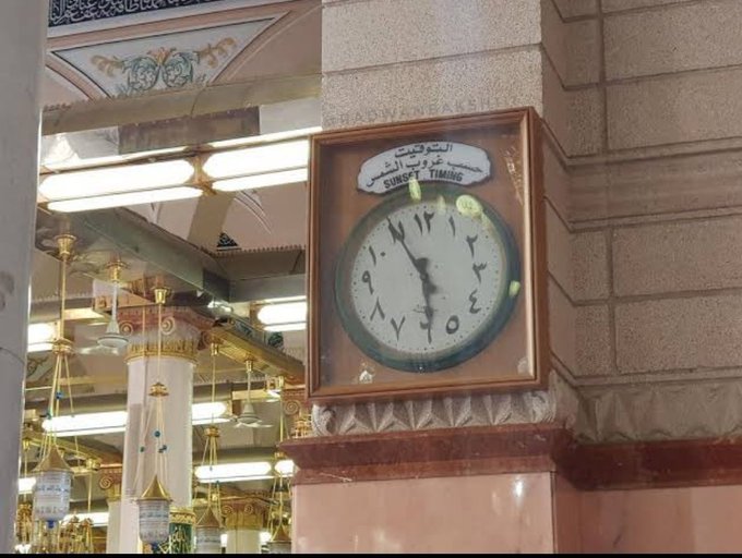 يحتفظ المسجد النبوي الشريف بهذه الساعة كساعة تراثية قديمة تعمل حتى اليوم وفق التوقيت الغروبي، وتبرز كمعلم تراثي أصيل يقاوم الزمن، يقف قبالتها الزوار في حيرة نظرا لنظامها التوقيتي الغامض، الذي يستند على غروب الشمس، ليبدأ اليوم الجديد بضبط العقارب على الثانية عشرة تماما،..