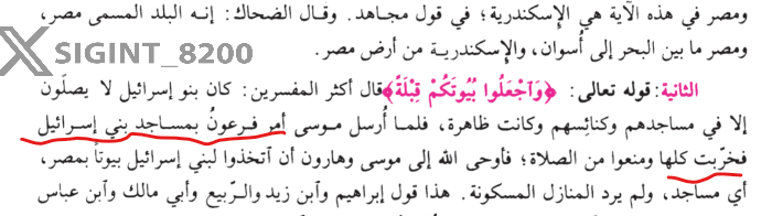 قال القرطبي : "كان بنو إسرائيل لا يصلون إلا في مساجدهم وكنائسهم وكانت ظاهرة🕌، فلما أرسل موسى أمر فرعون بمساجد بني إسرائيل فخربت كلها ومنعوا من الصلاة"