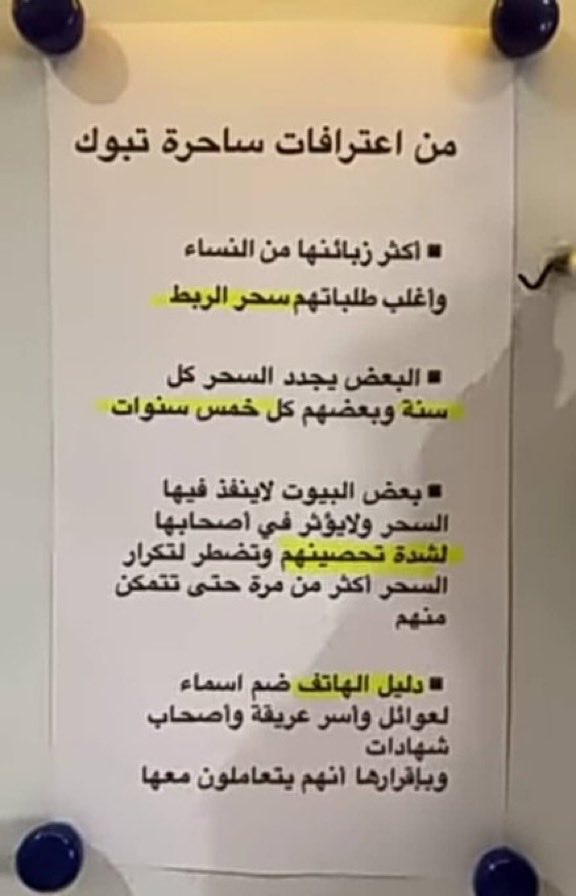 من اعترافات ساحرة تبوك: أكثر زبائنها من النساء، واغلب طلباتهم سحر الربط، البعض يجدد السحر كل سنة وبعضهم كل خمس سنوات، بعض البيوت لا ينفذ فيها السحر ولا يؤثر في أصحابها لشدة تحصينهم وتضطر لتكرار السحر أكثر من مرة حتى تتمكن منهم، دليل الهاتف ضم اسماء العوائل وأسر عريقة وأصحاب شهادات وبإقرارها أنهم يتعاملون معها ..