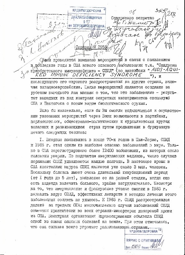 أبلغت وكالة الاستخبارات السوفييتية (KGB) زملاءها البلغاريين في سبتمبر 1985 أنها بدأت حملة من "التدابير النشطة" - أي الدعاية السرية - فيما يتعلق بفيروس نقص المناعة البشرية/الإيدز. وكتب الكي جي بي: "الهدف من هذه الإجراءات هو خلق رأي إيجابي لنا في الخارج ..