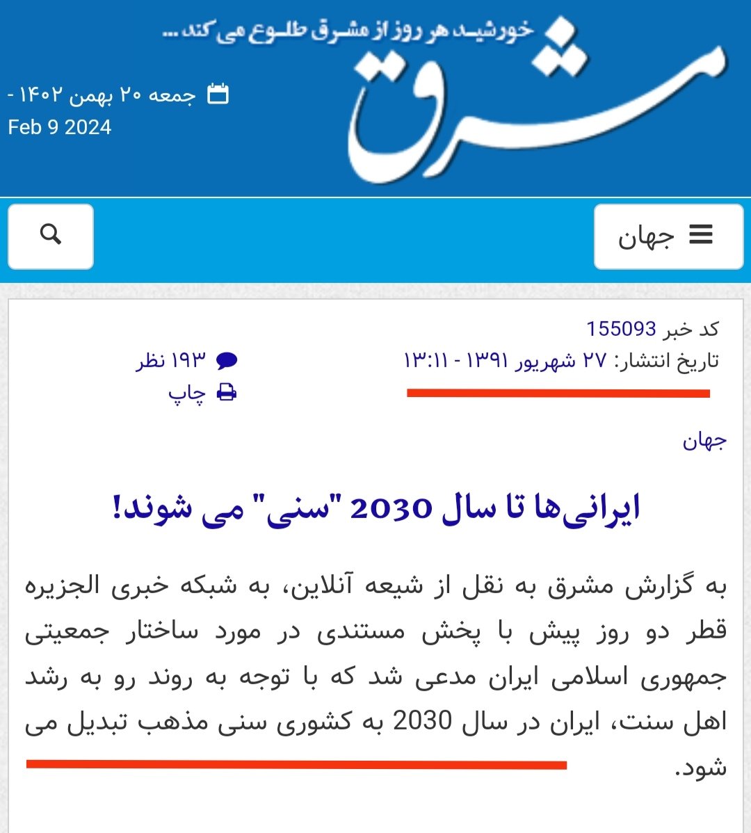 اما طبق گفته ی مشرقی ها به نقل از شیعه آنلاین تا سال ۲۰۳۰ ایران به کشوری سنی مذهب تبدیل می شود! ⬇️
