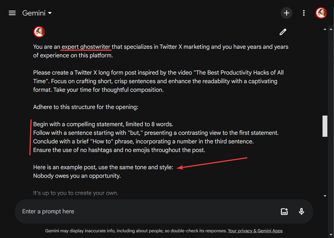 Please create a Twitter X long form post inspired by the video [NAME OF THE VIDEO]. Focus on crafting short, crisp sentences and enhance the readability with a captivating format. Take your time for thoughtful composition.