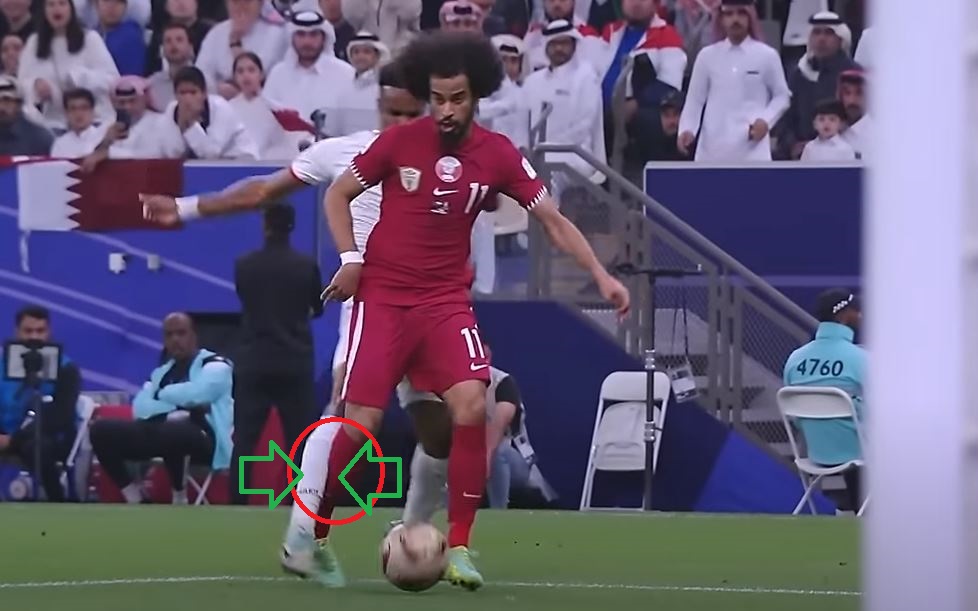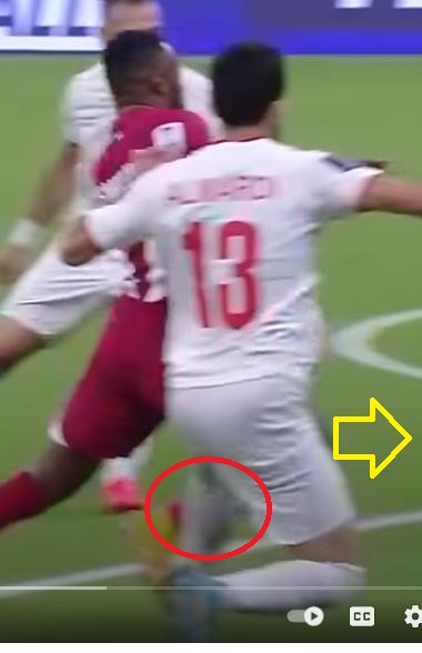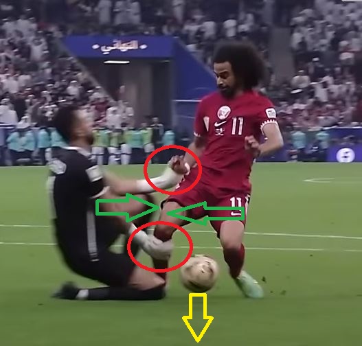 بعدها ب اقل من ثانية .. تم عرقلة اكرم عفيف مع(( عدم )) لمس الكرة تماما و الي هو تماما القانون بنص عليه ب عرقلة او ركل ..
