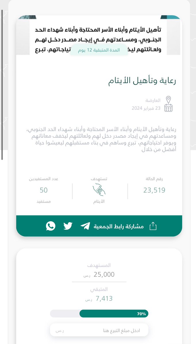 بفضل الله ثم بفضلكم أنجزنا 70٪ من مشروع كفالة 50 يتيم ومحتاج ، متبقي حوالي 10 ايتام ونغلق المشروع بالكامل