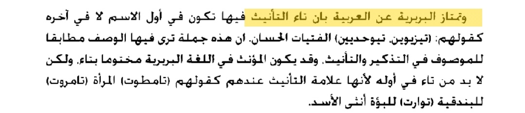 ▪︎""وتمتاز #البربرية عن العربية بان تاء التأنيث فيها تكون في أول الاسم لا في آخره كقولهم: (تيزيوين تيوحديين الفتيات الحسان أن هذه جملة ترى فيها الوصف مطابقا للموصوف في التذكير والتأنيث. وقد يكون المؤنث في اللغة البربرية مختوما بتاء. ولكن لا بد من تاء في أوله لأنها علامة التأنيث عندهم كقولهم (تامطوت المرأة (تامروت) للبندقية (توارت) للبؤة أنثى الأسد""!