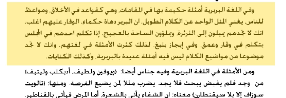 كذلك اللغة البربرية. فما وصلت إليه من #الازدهار و #الرقي في أحسن عهودها في الدولة الرستمية. وفي الدولة الصنهاجية والدولة الحمادية وفي دولة المرابطين ودولة الموحدين ودولة الحفصيين ودولة بنيمرين ودولة بني زيان ما وصلت إليه اللغة البربرية في عهود هذه الدول المغربية من رقى وازدهار وأساليب راقية. فأصول ذلك الازدهار وتلك الأساليب موجودة في #لغة_البرير_الأولين واللغة كالإنسان وكالنبتة. وكل شيء ناشئ لا يبلغ الكمال إلا إذا كان في أوله على القوة""!!