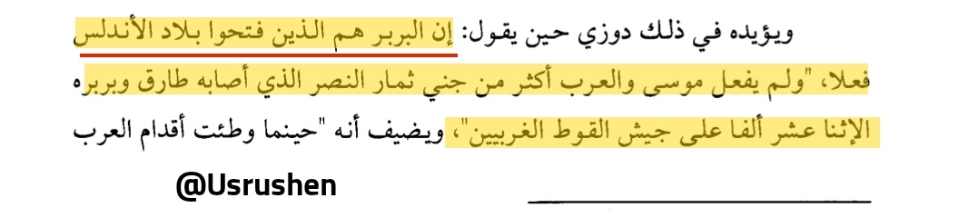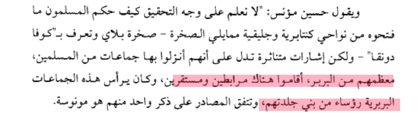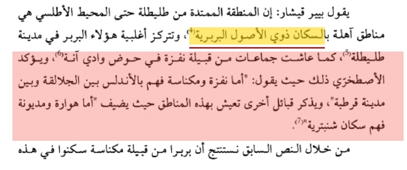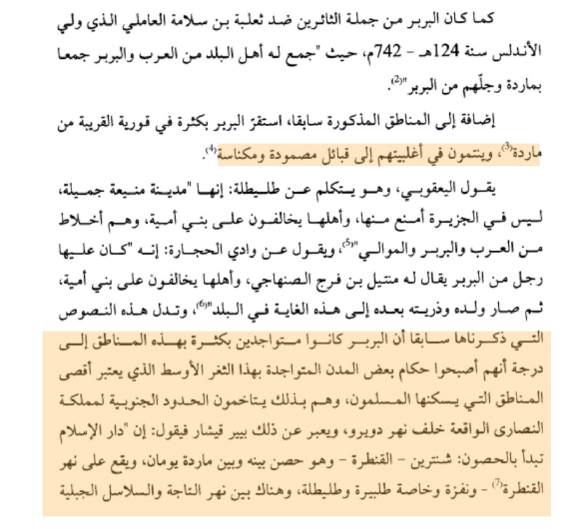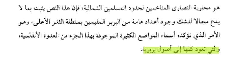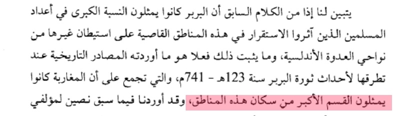 ▪︎""يتبين لنا إذا من الكلام السابق أن البربر كانوا يمثلون النسبة الكبرى في أعداد المسلمين الذين آثروا الاستقرار في هذه المناطق القاصية على استيطان غيرها من نواحي العدوة الأندلسية، وما يثبت ذلك فعلا هو ما أوردته المصادر التاريخية عند تطرقها لأحداث ثورة البرب، والتي تجمع على أن #المغاربة كانوا يمثلون القسم الأكبر من سكان هذه المناطق، وقد أوردنا فيما سبق نصين لمؤلفي كتاب "فتح الأندلس" وكتاب "أخبار مجموعة" يؤكدان فيهما هذه الحقيقة، ويؤيدهما"".