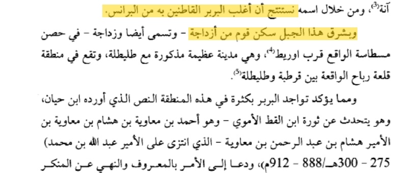 ▪︎""وبشرق هذا الجبل سكن قوم من #أزداجة في حصن مسطاسة الواقع قرب اوريط ، وهي مدينة عظيمة مذكورة مع طليطلة، وتقع في منطقة قلعة رباح الواقعة بين قرطبة وطليطلة، ومما يؤكد تواجد #البربر_بكثرة في هذه المنطقة النص الذي أورده ابن حيان وهو يتحدث عن ثورة ابن القط الأموي""!