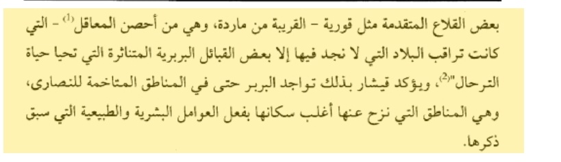 ▪︎ و شهادة اليعقوبي الرهيبة توضح لك ان هذا الثغر لا يسكنه إلا الاشاوس من الأمازيغ الذين يحمون ديار الإسلام فيكمل اليعقوبي شهادته فيقول :"" بعض القلاع المتقدمة مثل قورية القريبة من ماردة، وهي من أحصن المعاقل التي كانت تراقب البلاد التي لا نجد فيها إلا بعض #القبائل_البربرية المتناثرة التي تحيا حياة الترحال، ويؤكد قيشار بذلك تواجد #البربر حتى في المناطق المتاخمة للنصارى وهي المناطق التي نزح عنها أغلب سكانها بفعل العوامل البشرية والطبيعية التي سبق ذكرها""!