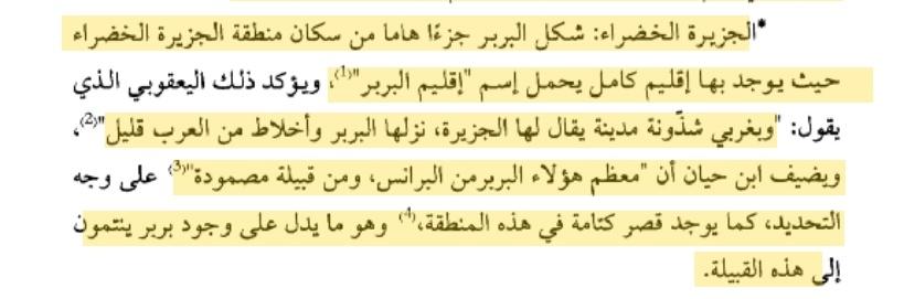 ▪︎نبدأ بالجزيرة الخضراء حيث يقول :"" الجزيرة الخضراء: شكل #البربر جزءًا هاما من سكان منطقة الجزيرة الخضراء حيث يوجد بها إقليم كامل يحمل إسم " #إقليم_البربر ويؤكد ذلك #اليعقوبي الذي يقول: وبغربي شذونة مدينة يقال لها الجزيرة، نزلها #البربر وأخلاط من العرب #قليل ويضيف ابن حيان أن معظم هؤلاء البربر من البرانس، ومن #قبيلة_مصمودة على وجه التحديد، كما يوجد قصر كتامة في هذه المنطقة، وهو ما يدل على وجود بربر ينتمون إلى هذه القبيلة""!!