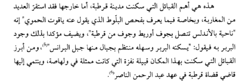 ▪︎""هذه هي أهم القبائل التي سكنت مدينة قرطبة، أما خارجها فقد استقر العديد من المغاربة، وبخاصة فيما يعرف بفحص البلوط الذي يقول عنه ياقوت الحموي" إنه ناحية بالأندلس تتصل بجوف أوريط وجوف من قرطبة، ويضيف مؤكدا بذلك وجود البربر به فيقول: يسكنه #البربر وسهله منتظم بجبال منها جبل البرانس ، ومن أبرز القبائل التي سكنت بهذا المكان قبيلة نفزة التي كانت ممثلة في ولهاصة، وينتمي إليها #قاضي_قضاة قرطبة في عهد عبد الرحمن الناصر""!!!