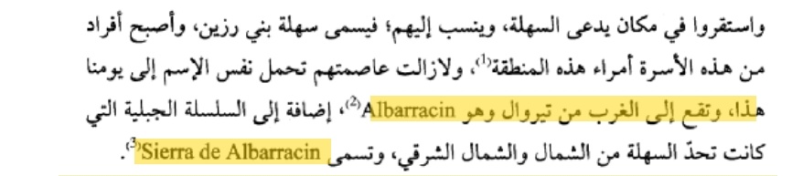 ▪︎و من المعلوم ان الطوبونوميا هي التي تعطينا أحد الادلة المهمة و نقرا في التاثير الطبونومي الذي رسخه بنو رزين في هذه المنطقة و منه يقول صاحب الكتاب:"" واستقروا في مكان يدعى السهلة، وينسب إليهم فيسمى سهلة بني رزين، وأصبح أفراد من هذه الأسرة #أمراء هذه المنطقة ولازالت عاصمتهم تحمل نفس الإسم إلى يومنا هذا، وتقع إلى الغرب من تيروال وهو (Albarracin) ، إضافة إلى السلسلة الجبلية التي كانت تحد السهلة من الشمال والشمال الشرقي، وتسمى ( Sierra de Albarracin).